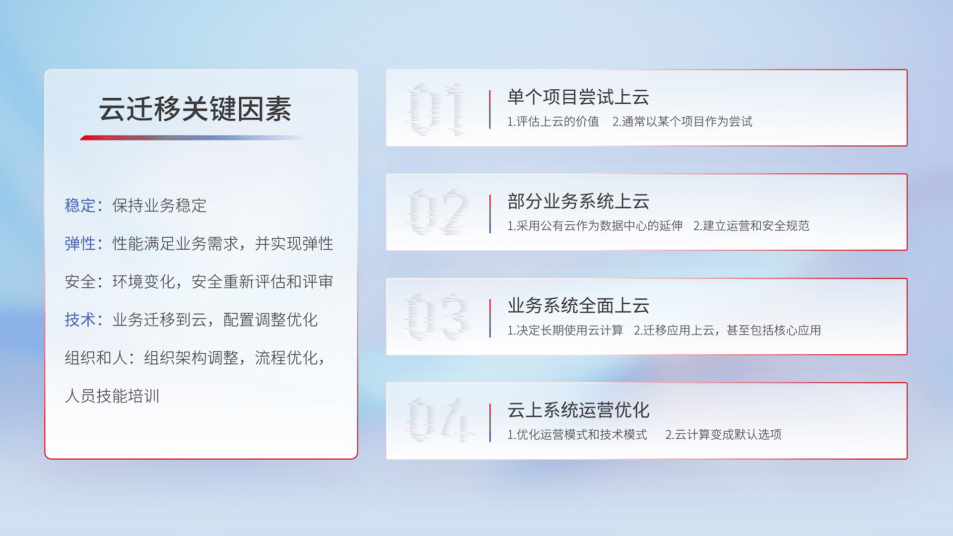 结合实际业务,,,从规划设计、、、、云平台选型、、、云原生改造、、、数据迁移、、、、集成交付,,迁移全过程为客户识别最佳上云路径,,做好风险识别管理,,设计网络架构、、身份权限、、、、安全审计合规、、、、操作审计、、、日志审计、、、、监控告警策略、、、多站点容灾设计等,,,对云上基础设施进行整体规划,,提升IT治理水平,,以满足弹性、、、、高可用、、、高性能的需求。。。。