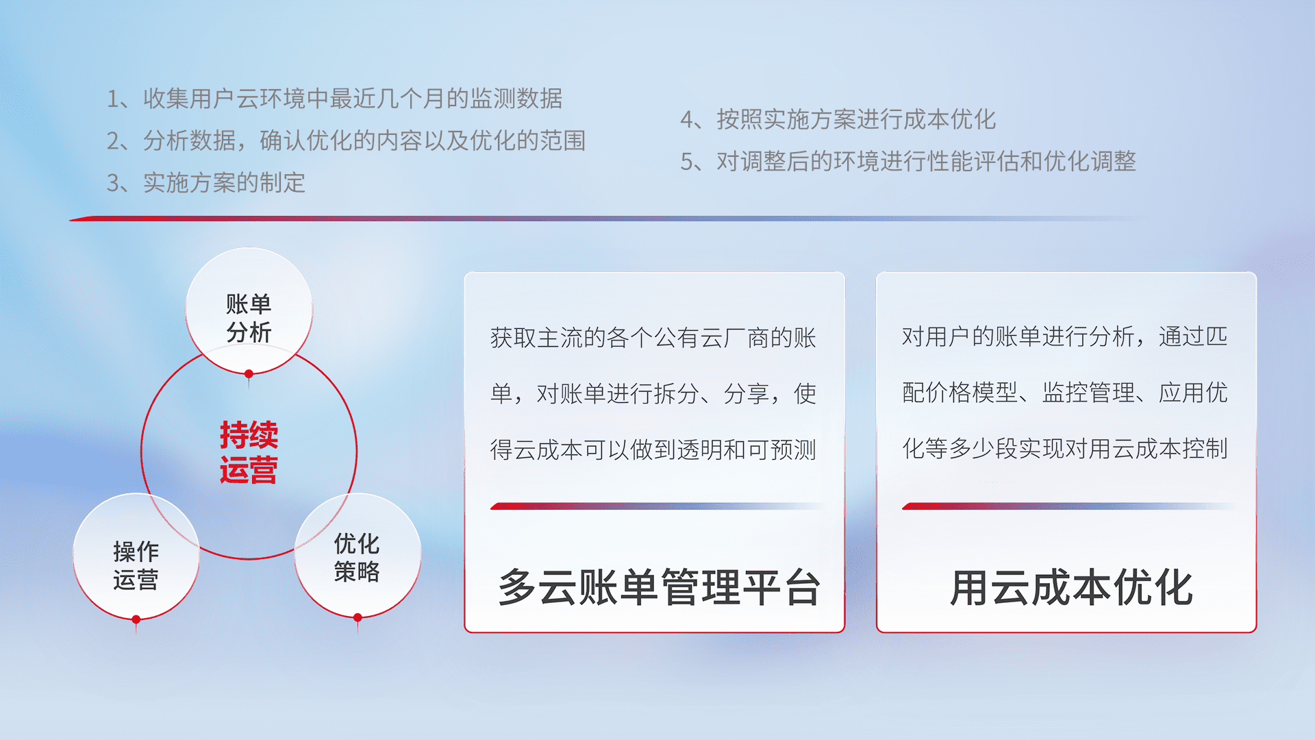 通过多云纳管,,以统一的资源数据模型把客户的云资源进行抽象和封装,,进而实现对多云资源的统一操作,,,保障云资源管理的可靠性、、稳定性与可用性。。。。量身定制化运维内容,,,配置、、开发运维、、、、补丁管理、、、、备份、、、、监控、、、认证和访问管理、、、、审计和日常巡检等,,,保障在用云过程中的可靠度,,,稳定度以及高可用率。。